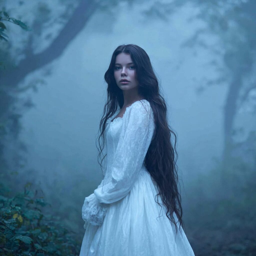 Mała postać w białej koszuli nocnej.