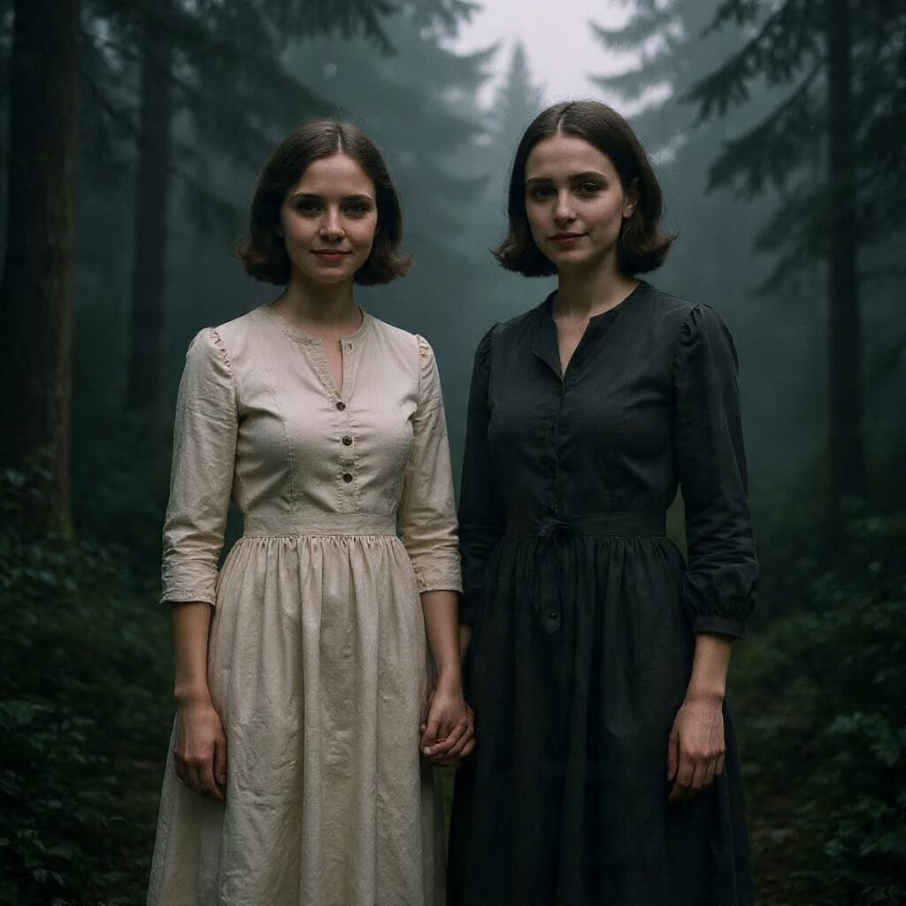Leżała na nim mała, drewniana ramka. Stara, przetarta na brzegach, ze złoceniem, które prawie całkiem zniknęło. W środku — fotografia. Dwie młode kobiety, jedna w ciemnej sukni, druga w jasnej, stały obok siebie, trzymając się za ręce. I obie się uśmiechały.